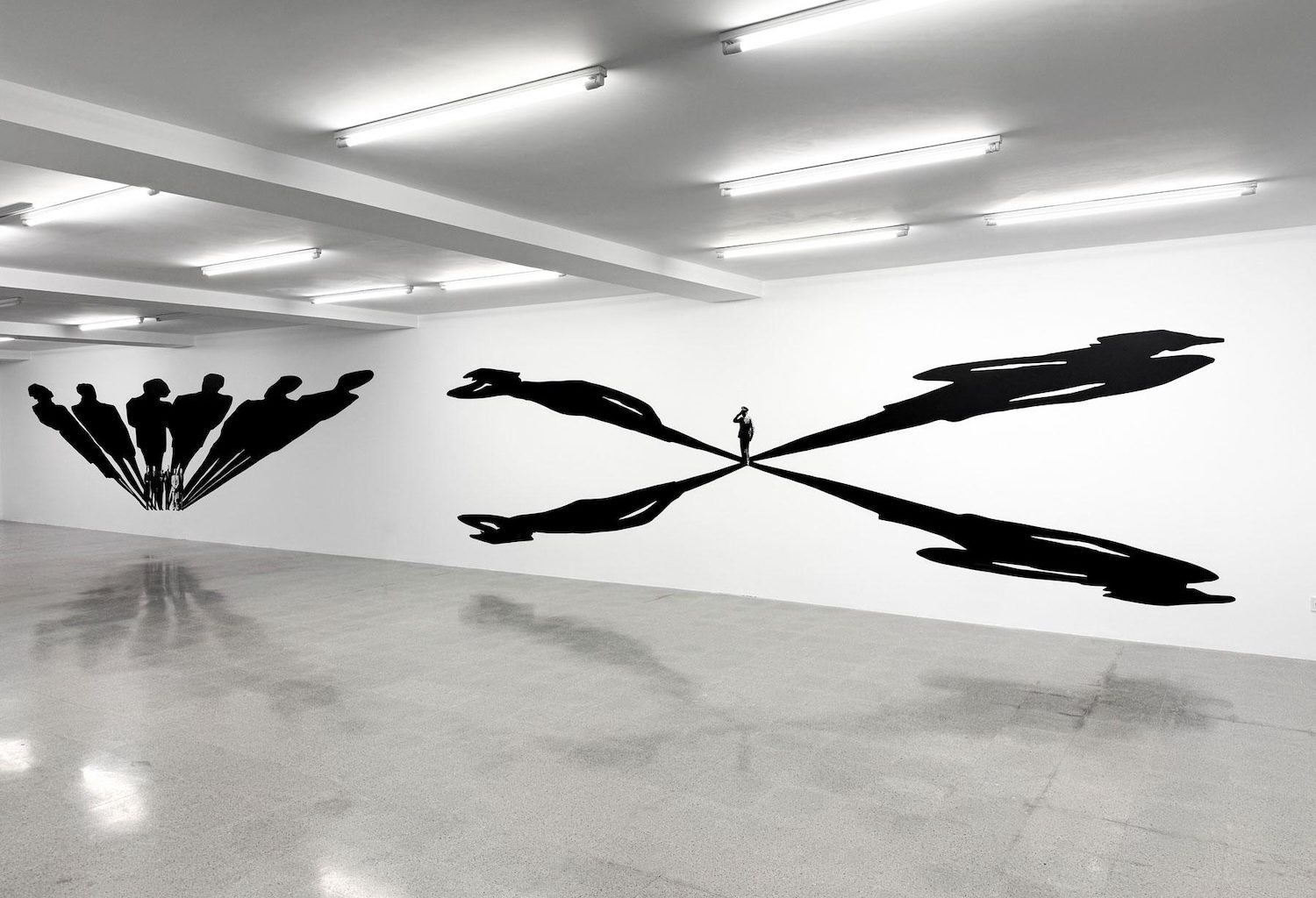 Desde finales de los años ochenta, Silveira ha expandido la gráfica hacia el espacio arquitectónico y urbano, generando intervenciones que responden a edificios y lugares específicos y que transforman la experiencia del público. Salir de la institución y de los circuitos del arte, y dialogar de manera directa con la ciudadanía, es fundamental para la artista. En la instalación realizada en el Palacio de Cristal del Museo Reina Sofía, Lumen (2005), la transparencia y la luz del edificio historicista —relacionado con un pasado colonial aún activo— amplificaban el juego entre ilusión y materialidad, convirtiendo el espacio en un territorio de presencias fantasmales. En la_oficina, por el contrario, la escala íntima de la galería permite un contacto más concentrado, casi corporal, con las sombras. La arquitectura se revela, más allá del cubo blanco, como interlocutora activa.