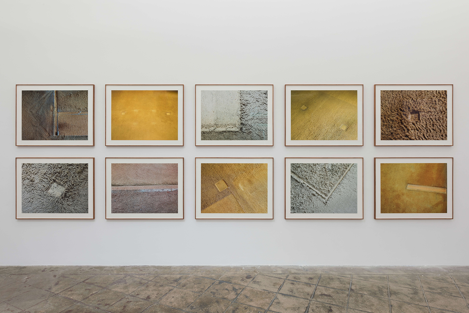 Al igual que Linterna mágica, Huellas es consecuencia del punto de vista detectivesco desde el cual decidí volver a mirar Casa Barragán. En lugar de la mirada del turista o del experto en arquitectura que va al lugar santo a comprobar que las imágenes de los libros se cumplen en la realidad, y que la pared rosa está ahí y la delgada y mítica escalera de madera no se ha movido de lugar, yo intenté verlo todo desde un ángulo chueco, raro, distinto al que estamos habituados. Así descubrí, por ejemplo, que debajo de la mesa del comedor hay varios timbres, para los cuales, me vine a enterar, Barragán diseñó un complicado código de timbrados, donde dos podían significar “traer la champaña” y tres “llamarme con urgencia pues la conversación se está poniendo muy aburrida”. Y una vez a gatas me di cuenta también de que la rigurosidad con que Barragán acomodó cada mesa, cada silla, cada objeto, debía tener alguna consecuencia física, ya que eran años de cosas puestas, al milímetro, en el mismo sitio, inamovible. Y, en efecto, al quitar una silla, vi que la alfombra guardaba la huella de eso que la había pisado durante décadas. Imaginé entonces un especie de plano arquitectónico hecho de huellas de muebles. Como si la vida de la casa hubiera quedado estampada en el piso y pudiera reconstruírsela con solo observar la cuidada coreografía de armarios, sillas y toda clase de enseres que fue teniendo lugar a lo largo de los años –pues aquella mesita tal vez estuvo un par de años en la esquina contraria, por lo cual una huella tenue aparece todavía por allá. Para hacer esta serie tuvimos que, con todo cuidado y ayuda de restauradores, mover todo el mobiliario de la casa, lo cual fue maravilloso: poder visualizar esa casa vacía, como una tabula rasa. Y fue curioso descubrir ahí, a nivel del suelo, y gracias a una cámara superpotente, todo el universo de cosas y habitantes minúsculos que han ido conquistando la planta de esta célebre morada: polvo, desde luego, pero no solo gris, sino de colores increíbles, azules, lilas, en fin, partículas cuya diversidad no había imaginado posible; además, claro, de cadáveres de moscas y otros bicharracos, pedazos de papel, etc. Sin embargo, nada me mostró con más claridad el paso del tiempo que el cambio profundo de tonalidad entre los fragmentos de alfombra que quedaron debajo de los muebles, de un amarillo brillante, un blanco inmaculado, y el resto de los tapetes, desvaídos y, por momentos, casi deshilachados. Esta clase de marcas, desde luego, no se ven únicamente en las casas de personajes tan obsesivos y meticulosos, como lo era Barragán, y, por eso, Huellas es también una metáfora, o yo quiero que sea, de cómo la vida transforma el espacio y va dejando rastros y cicatrices sobre las cosas. Es como si esas formas huecas que dejan las patas de las mesas y los sillones sobre la alfombra no estuvieran vacías, sino llenas de lo que estuvo ahí alguna vez.