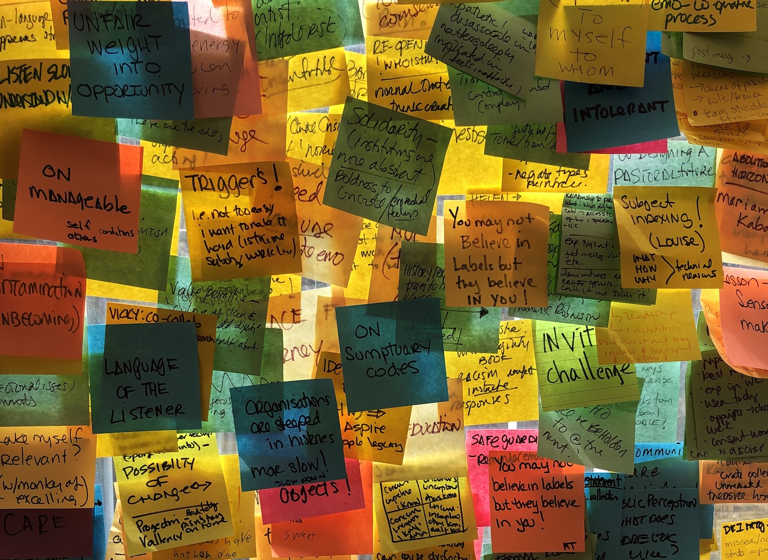 Al final del proyecto tenía que escribir un artículo, y se esperaba que versara sobre la igualdad en un registro académico. Sin embargo, no tenía ningún interés en hacer eso y no me parecía ni útil ni práctico. Así que la socióloga Karen Salt se sumó al proyecto como mentora para apoyar mi investigación desde otra perspectiva. El resultado fue document 0 [1]: una publicación muy personal conformada por conversaciones con más de 30 personas, además de toda mi experiencia dentro de las instituciones (trabajaba con siete en ese momento). Realmente me interesaba esta idea de cómo las instituciones brindan (o no) cuidados a su personal de forma implícita y explícita, y cómo estos se pueden encarnar en las políticas institucionales.